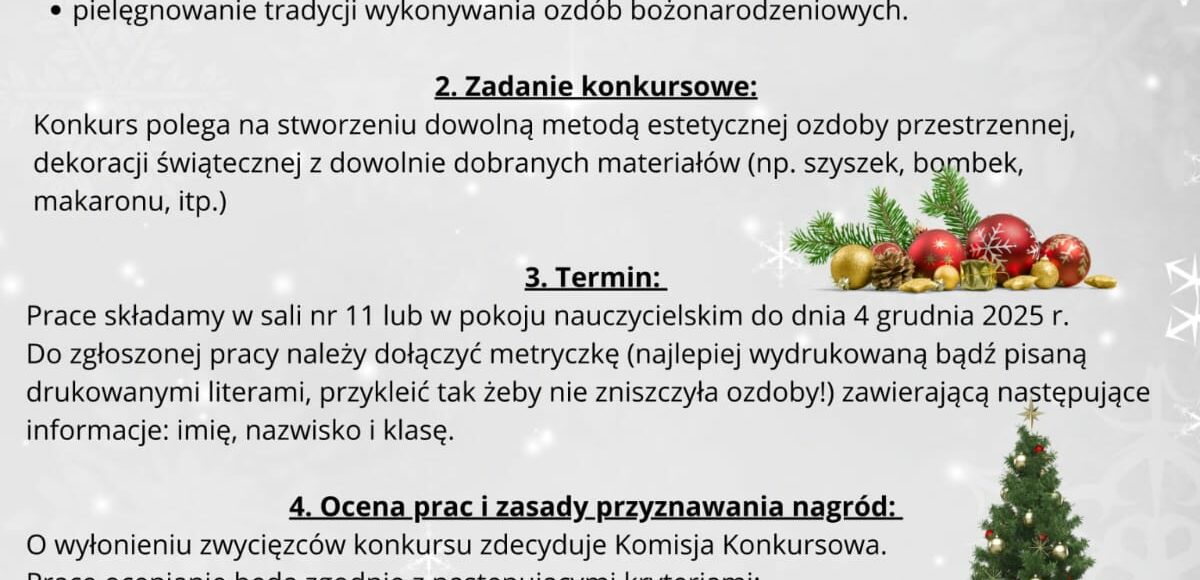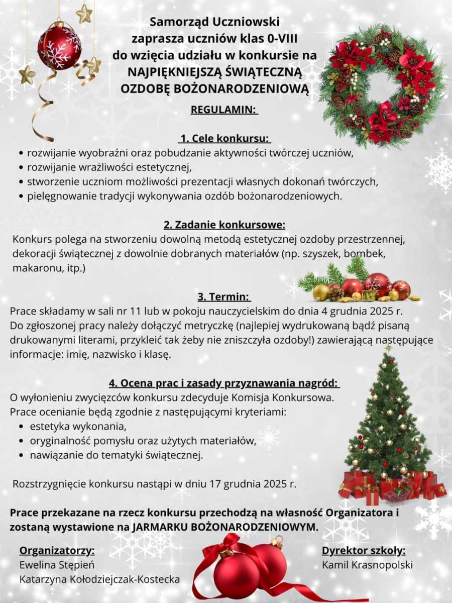 6 listopada 2025 NAJPIĘKNIEJSZA ŚWIĄTECZNA OZDOBA BOŻONARODZENIOWA-KONKURS Samorząd Uczniowski zaprasza uczniów klas O-VIII do wzięcia udziału w konkursie na NAJPIĘKNIEJSZĄ ŚWIĄTECZNĄ OZDOBĘ BOŻONARODZENIOWĄ. Więcej informacji po kliknięciu w zdjęcie.