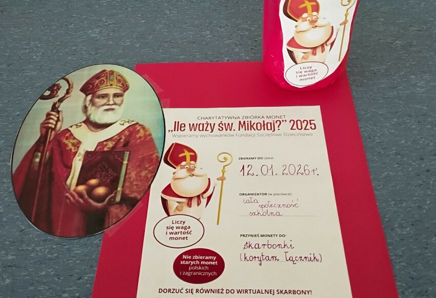 Zapraszamy do charytatywnej zbiórki monet „Ile waży św. Mikołaj?” 2025. Dzięki zbiórce mamy możliwość wsparcia wychowanków Fundacji Szczęśliwe Dzieciństwo. Do 12 stycznia 2026 r. przynieś monety i wrzuć do skarbonki znajdującej się w łączniku szkoły. Liczy się waga i wartość monet. Uwaga, nie zbieramy starych monet polskich i zagranicznych.