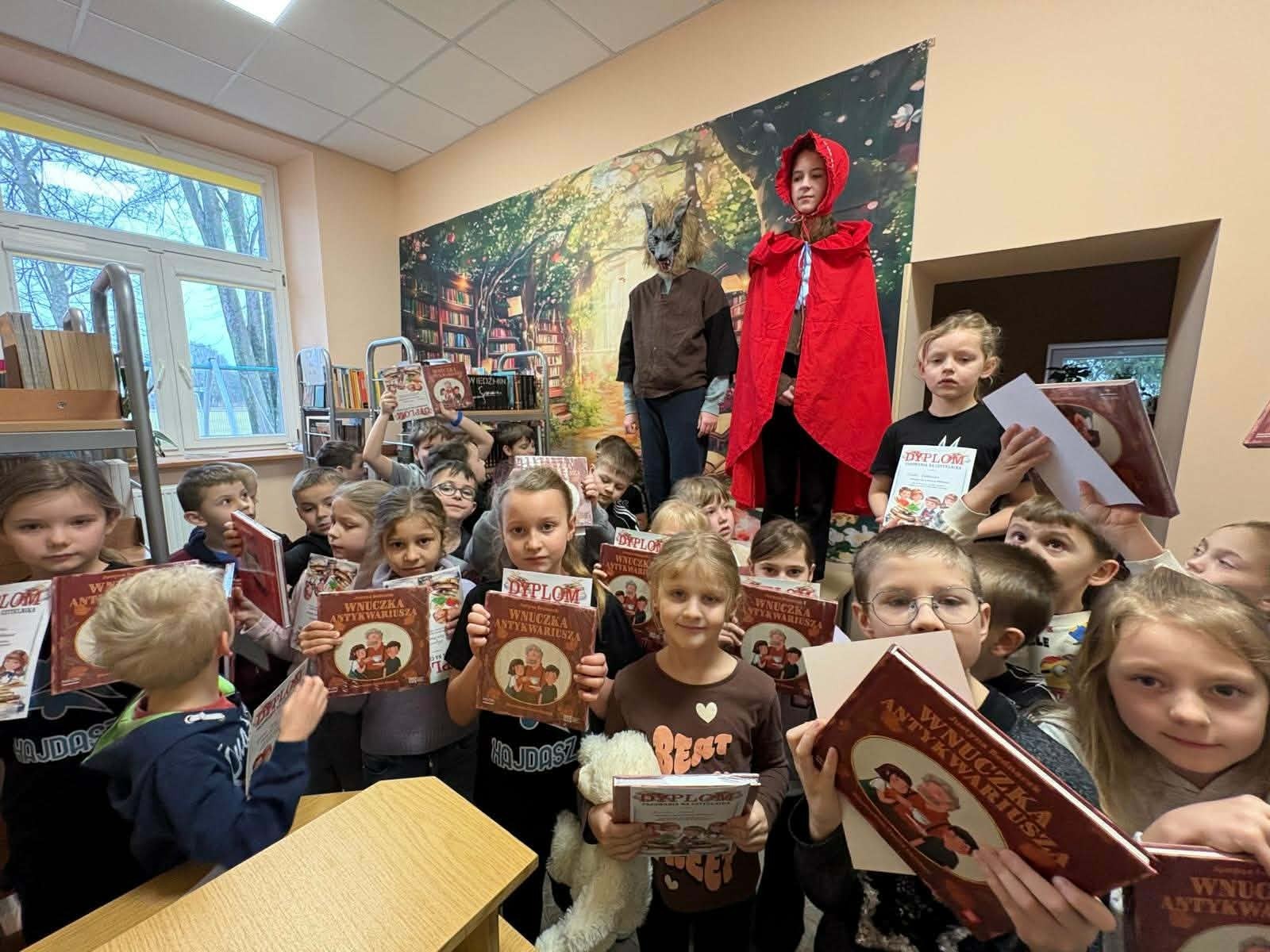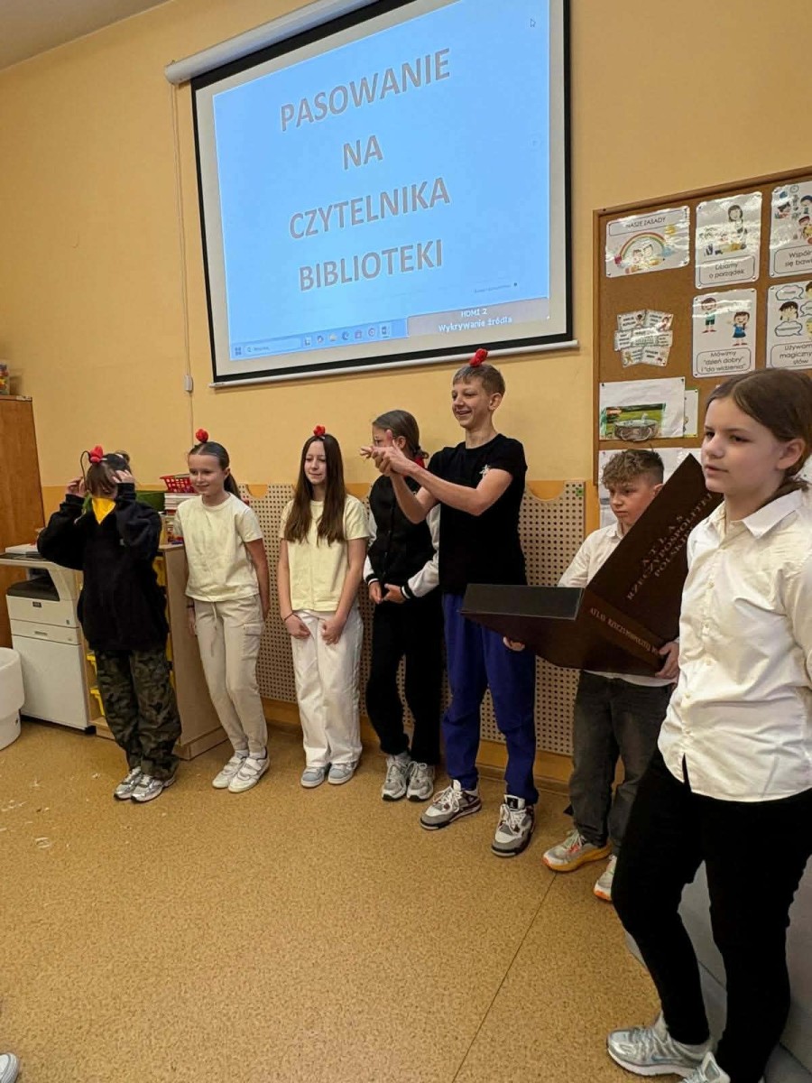 Pasowanie pierwszoklasistów na czytelników biblioteki.